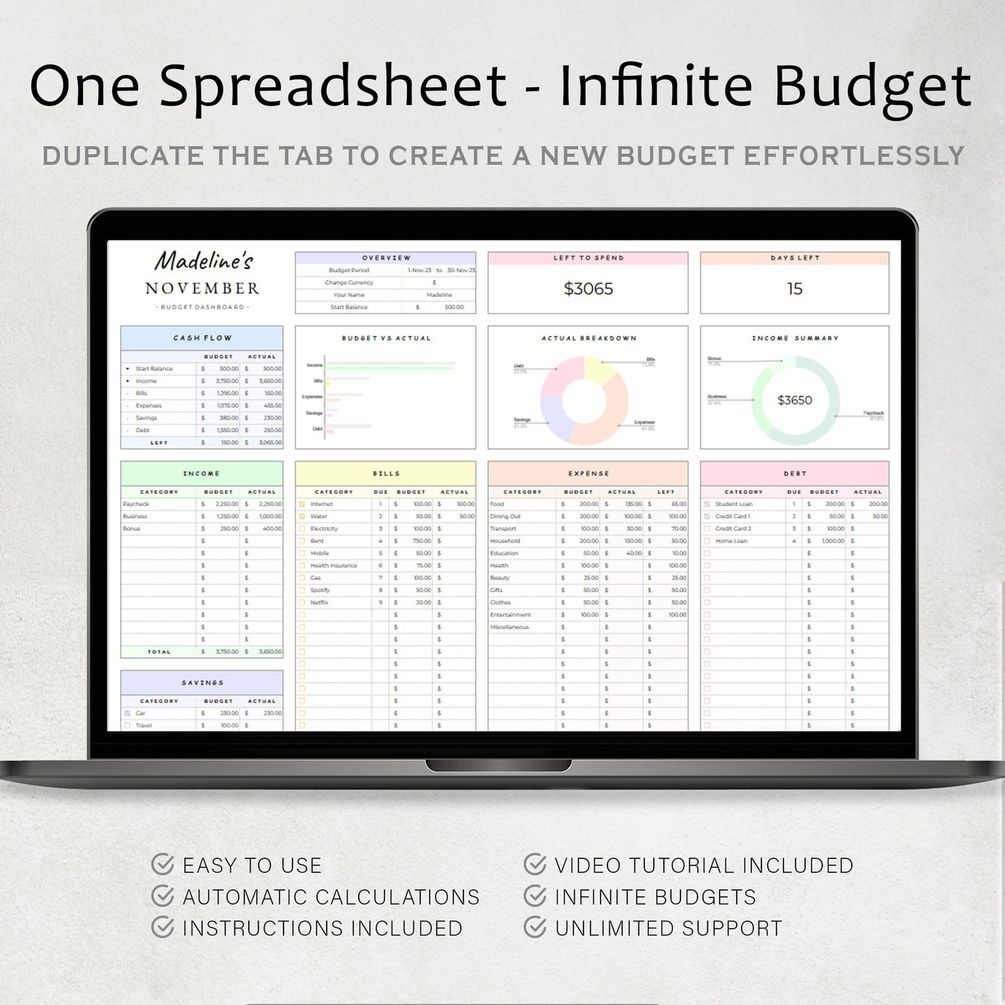 Financial Planner Budget Spreadsheet Tracker Template, Monthly, Weekly, Bi-weekly